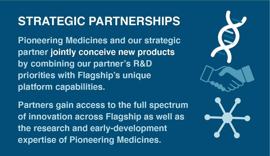 Pioneering Medicines is building an extensive portfolio of medicine programs with the potential for significant therapeutic impact and associated value generation. We look to unlock the full potential of Flagship’s innovations by conceiving new product concepts both internally within the Flagship ecosystem and in collaboration with strategic partners.